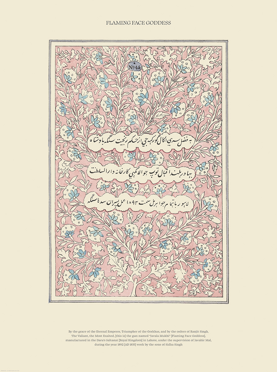 By the grace of the Eternal Emperor, Triumpher of the Gorkhas, and by the orders of Ranjit Singh, The Valiant, the Most Exalted, [this is] the gun named “Javala Mukhi” [Flaming Face Goddess], manufactured in the Daru’s Saltanat [Royal Kingdom] in Lahore, under the supervision of Javahir Mal, during the year 1892 [AD 1835] work by the sons of Sidha Singh